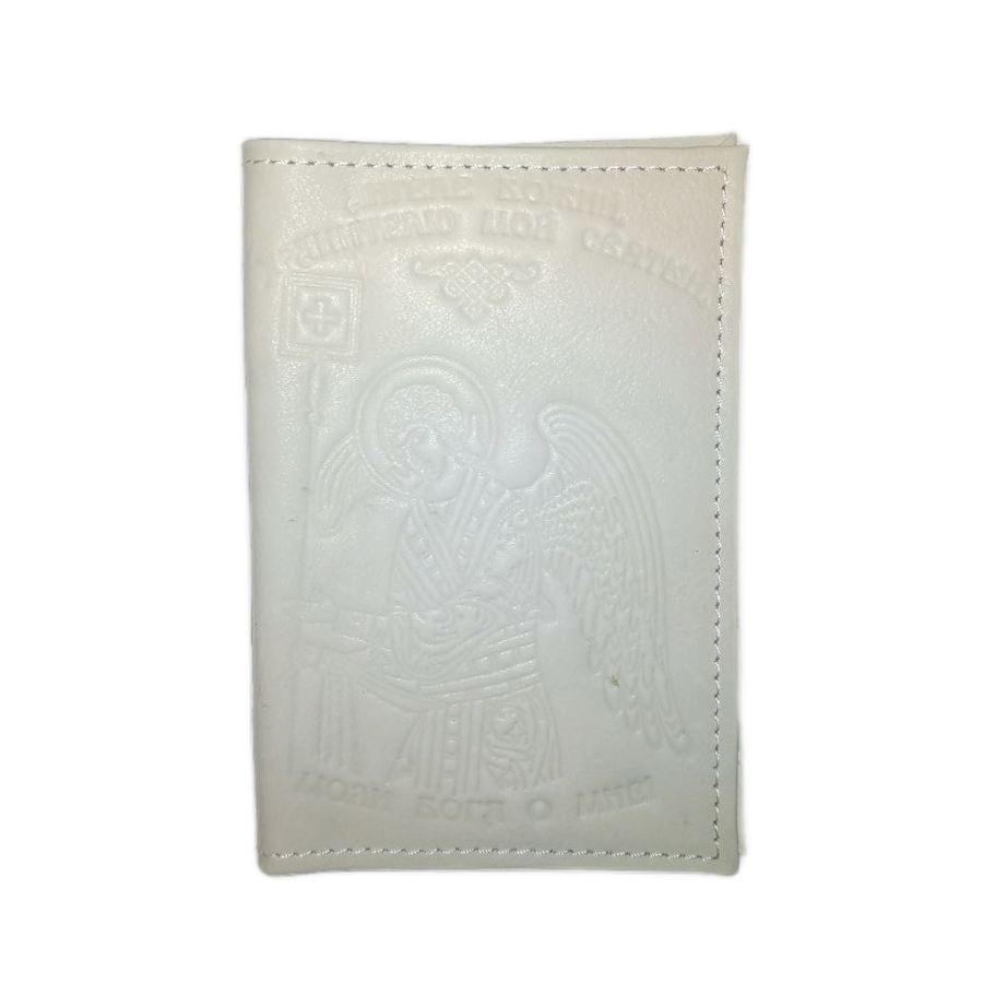 8101Ан Обложка для паспорта из кожи с тиснением Ангела-хранителя (белая)