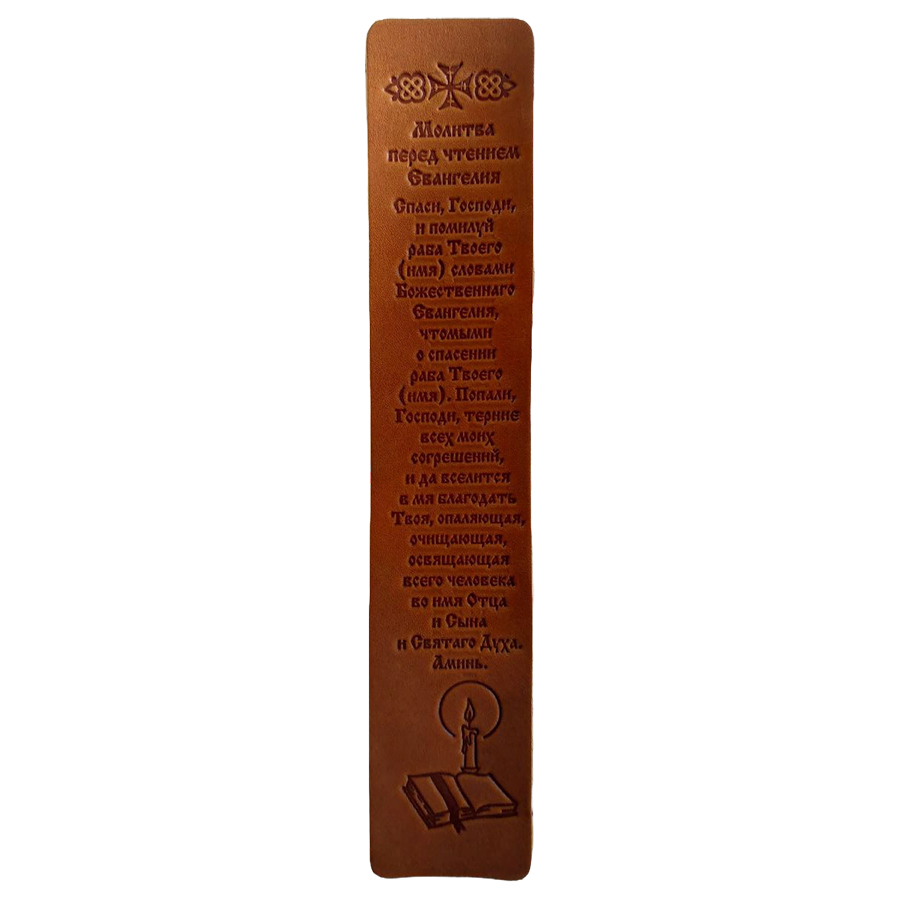 Уникальная закладка, выполненная из натуральной кожи и украшенная тиснением молитвы перед чтением Евангелия.